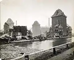 On 19 January, a fire broke out in the melt-pot room, and efforts to put it out were under way when approximately 50 long tons (50 t) of TNT ignited at 6:52 pm. The TNT plant was destroyed instantly, as were many nearby buildings, including the Silvertown Fire Station. Much of the TNT was in railway goods wagons awaiting transport.[4] Debris was strewn for miles around, with red-hot chunks of rubble causing fires. A gas holder was damaged on Greenwich Peninsula, creating a fireball from 200,000 cubic metres (7,100,000 cu ft) of gas; the holder was later repaired and remained until 1986. Several thousand pounds' worth of goods were also destroyed in nearby warehouses, estimated by the Port of London Authority to span 7 hectares (17 acres).[5] The chancel and church hall of the local church, St Barnabas', were destroyed, only to be replaced in 1926.[6]