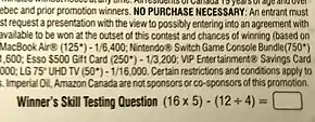 The most common form that these questions take is as an arithmetic exercise. A court decision ruled that a mathematical STQ must contain at least three operations to actually be a test of skill. For example, a sample question is "(16 × 5) - (12 ÷ 4)" (Answer: 77). The winner should not receive any assistance (e.g. using a calculator, asking another individual to calculate the answer for the winner) in answering the STQ. Enforcement of these rules is not very stringent, especially for small prizes. Enforcement is often impossible if the winner chooses the time and location to answer the question (for example, the question is attached to the prize claim form). In most cases, there is no individual monitoring to ensure the integrity of answering STQ without assistance and the winner will submit the claim form having affirmed that they completed STQ without any assistance. In some cases, the player may not be required to answer the STQ to claim a prize. The questions are also becoming easier.[1] For contests held in other countries but open to Canadians, a STQ must be asked of any potential Canadian winner.
