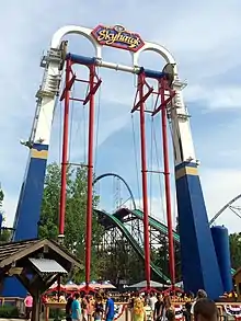 Skyhawk is a Screamin' Swing type ride built by S&S Worldwide. The structure itself is 103 feet (31 m) tall at its highest point, the equivalent height of a ten-story building. It consists of two swinging arms, both 84 feet (26 m) tall, seating 20 across and 20 back to back (40 total).[1] At full swing, the ends of the arms approach 125 feet (38 m) high off the ground—as high as a twelve-story building—and achieve a maximum velocity of 65 miles-per-hour—faster than most wooden roller coasters. The ride lasts about one minute, and can accommodate 800 passengers per hour. Riders must be 48 inches (1,200 mm) or taller.[2] Riders are restrained by a lap bar.[3]