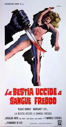 Slaughter Hotel (Italian: La bestia uccide a sangue freddo), also known as Asylum Erotica and Cold Blooded Beast, is a 1971 Italian giallo horror film directed by Fernando Di Leo and starring Klaus Kinski.[1] The film follows a masked killer murdering the wealthy female inmates of a sanitorium. The building that was used as the mental hospital in this film was used several years earlier as the set for the 1966 giallo The Murder Clinic.[2]