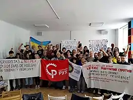 The Social Movement maintains links with a number of foreign socialist parties, organizations and initiatives. On the eve of the 2022 Russian invasion of Ukraine, the Social Movement called on left-wing foreign countries for anti-war solidarity against the threat of Russian imperialism,[26] which it also condemned in a joint statement with the oppositional Russian Socialist Movement.[27] A letter to the Western Left from Kyiv written by one of the Social Movement activists who joined Territorial Defense (Teroborona) units gained international publicity.[28]