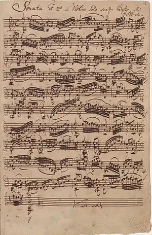 The sonatas and partitas for solo violin (BWV 1001–1006) are a set of six works composed by Johann Sebastian Bach. They are sometimes referred to in English as the sonatas and partias for solo violin in accordance with Bach's headings in the autograph manuscript: "Partia" (plural "Partien") was commonly used in German-speaking regions during Bach's time, whereas the Italian "partita" was introduced to this set in the 1879 Bach Gesellschaft edition, having become standard by that time.[1] The set consists of three sonatas da chiesa in four movements and three partitas (or partias) in dance-form movements. The 2nd Partita is widely known for its Chaconne, considered one of the most masterly and expressive works ever written for solo violin.[2]