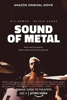 Sound of Metal is a 2019 American drama film directed and co-written by Darius Marder. It stars Riz Ahmed as a metal drummer who loses his hearing, and also features Olivia Cooke, Paul Raci, Lauren Ridloff, and Mathieu Amalric. Sound of Metal had its world premiere in the Platform Prize program at the 2019 Toronto International Film Festival on September 6, 2019. Amazon Studios released the film in theaters on November 20, 2020, and on Amazon Prime Video on December 4. The film was critically acclaimed, with particular praise for the performances of Ahmed and Raci, the sound design, the editing and Marder's direction and screenplay. It was listed on 52 film critics' top-ten lists for 2020. At the 93rd Academy Awards, it was nominated for Best Picture, Best Original Screenplay, Best Actor (Ahmed) and Best Supporting Actor (Raci), and won for Best Sound and Best Film Editing.[4]