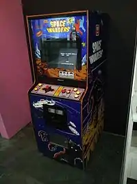 Taito released Space Invaders in July 1978.[13] They released both an upright arcade cabinet and a so-called "cocktail-table" cabinet; following its usual practice, Taito named the cocktail version T.T. Space Invaders ("T.T." for "table-top"). Midway released its upright version a few months later and its cocktail version several months after that. The cabinet artwork featured large humanoid monsters not present in the game; Nishikado attributes this to the artist basing the designs on the original title of "Space Monsters", rather than referring to the actual in-game graphics.[23] In the upright cabinets, the game graphics are generated on a hidden CRT monitor and reflected toward the player using a semi-transparent mirror, behind which is mounted a plastic cutout of a moon bolted against a painted starry background. The backdrop is visible through the mirror and thus appears "behind" the graphics.[5] Both Taito's and Midway's first Space Invaders versions had black-and-white graphics with a transparent colored overlay using strips of orange and green cellophane over certain portions of the screen to add color to the image. Later Japanese releases used a rainbow-colored cellophane overlay,[5] and these were eventually followed by versions with a color monitor and an electronically generated color overlay.[5]