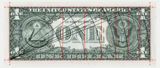 On the reverse of the current US one-dollar bill, the "large inner box" has a length-to-width ratio of the square root of 7, and a diagonal of 6.0 inches, to within measurement accuracy.[16]