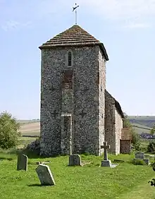 The Domesday survey mentioned a church at Annington as well as the manor house,[3][5] and architectural evidence suggests that St Botolph's Church is of Saxon origin—confirming that only one church served the parish,[2][8] rather than each settlement having its own place of worship as was once believed.[5] The dedication to St Botolph is thought to be original; but around the time of the Norman conquest the church was officially rededicated to St Peter de Vetere Ponte (meaning St Peter of the Old Bridge). In 1254, the dedication to St Botolph reappeared in print, and the two names were used interchangeably for a period as use of the old name was maintained by locals.[5] By the 15th century, the newer dedication to St Peter fell out of use.[3] Another historic dedication, to St Mary, has also been suggested.[7] The existence of another St Peter's Church at nearby Beeding has been suggested as a reason for the dedication reverting to St Botolph.[9]