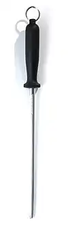 A honing steel, sometimes referred to as a sharpening steel, whet steel, sharpening stick, sharpening rod, butcher's steel, and chef's steel, is a rod of steel, ceramic or diamond-coated steel used to restore keenness to dulled blade edges. They are flat, oval, or round in cross-section and up to 30 centimetres (1 ft) long. The steel and ceramic honing steels may have longitudinal ridges, whereas the diamond-coated steels are smooth but embedded with abrasive diamond particles.[2]