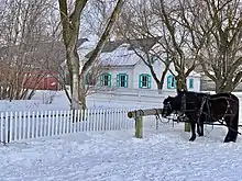 Contrary to the preferences of the Canadian government, the early settlers of Steinbach, like other Mennonite villages, organized the village into a Strassendorf, or street village, with each family occupying a long narrow strip known as a Wirtschaft.[9] In the first year they built temporary shelters known as semlin, before building more permanent housebarns. Most of the settlers were farmers, but in a somewhat urban setting, and lived, to some degree, communally, and shared a common pasture at the end of the village. They started a school in the first year, and in the following year of 1875 built a school and teacherage.[12] Steinbach's Main Street was hacked out of thick poplar bush along the creek, where a bison trail ran, a trail that was still used by Indigenous people during Steinbach's early years.[10]