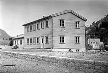 Like the other stations along the Sørlandet Line, the station building received a standardized design. It was built in the overall Neoclassical architecture style adapted in the 1920s. By the 1940s the designs had been altered to include elements of Functionalism.[2] The station building, designed by Gudmund Hoel, was identical to the one at Audnedal Station. The 180 square meters (1,900 sq ft) building is wooden with a concrete foundation. It has siding in wood and a gable roof. The building consists of a main section, where the lower story originally featured a ticketing and waiting room, and an upper story with the station master's residence. The annex was allocated cargo handling.[3]