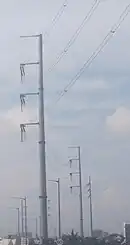 - Steel pole 13 (of suspension or flag design, in the foreground) and 14 (of anchor or flag design, in the background) of the transmission line along the east side of the Gregorio Araneta Avenue