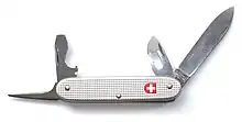 The Swiss Army knife is a pocketknife, generally multi-tooled, now manufactured by Victorinox.[1] The term "Swiss Army knife" was coined by American soldiers after World War II after they had trouble pronouncing the German word "Offiziersmesser", meaning "officer’s knife".[2]