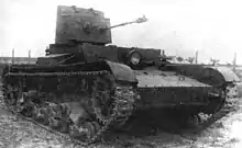 Flame-throwing tanks formed around 12 per cent of the series production of T-26 light tanks.[1] It should be mentioned that the abbreviation "OT" (Ognemetniy Tank which stands for Flame-throwing Tank) appeared only in post-war literature; these tanks were originally called "KhT" (Khimicheskiy Tank which stands for Chemical Tank), or BKhM (Boevaya Khimicheskaya Mashina; Fighting Chemical Vehicle) in the documents of the 1930s. All chemical (flame-throwing) tanks based on the T-26 chassis (KhT-26, KhT-130, KhT-133) were designated BKhM-3. The vehicles were intended for area chemical contamination, smoke screens and for flame-throwing.