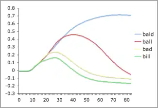 Figure 1 - A simple TRACE simulation. Word activation and competition unfolds in time. In this simulation, the word "bald" becomes the most active, therefore it is considered to be the one that is recognized.