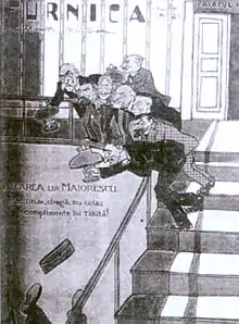 The PCD was soon joined by Ion Luca Caragiale,[12][21] who characterized Take Ionescu as "An indefatigable and wise patriot",[7] by the future diplomat Nicolae Titulescu,[22][23][24] by the doctor Constantin Istrati, the writer Barbu Ştefănescu-Delavrancea, the journalist Nicolae Xenopol, the former mayor of Iaşi Gheorghe Lascăr, the landowners Constantin Cantacuzino Paşcanu and Alexandru Bădărău,[20] as well as by Xeni, who left a eulogistic account of his mentor.[7] It became the target of attacks from both the PNL and the Conservatives, and was faced with the reticence of King Carol I.[2][20] Nevertheless, Xeni contended, the new grouping profited from Ionescu's popularity with the lower strata of Romanian society, being identified as "one of their own".[2] In this version of events, mainstream politicians allegedly convinced Carol that the PCD had an agenda to depose the ruling House of Hohenzollern-Sigmaringen, and had depicted Ionescu as "a 'Belzebuth' who was supposed to be removed from public life".[2]