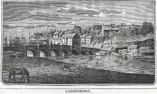 During the Middle Ages, the settlement then known as Llanteulyddog ('St Teulyddog's)[11] accounted one of the seven principal sees (Cantrefi) in Dyfed.[12] The strategic importance of Carmarthen caused the Norman William fitz Baldwin to build a castle there, probably about 1094. The current castle site is known to have been occupied since 1105. The castle itself was destroyed by Llywelyn the Great in 1215, but rebuilt in 1223, when permission was given for a town wall and crenellations, making it one of the first medieval walled towns in Wales. In 1405, the town was captured and the castle sacked by Owain Glyndŵr. The Black Book of Carmarthen of about 1250 is associated with the town's Priory of SS John the Evangelist and Teulyddog.