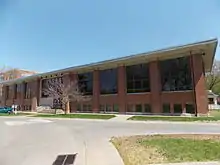 The Davenport architectural firm of Charles Richardson Associates designed the building that was built by Priester Construction in 1973 for $1.9 million.[3] The 103-by-71-foot (31 by 22 m), three-story structure follows a rectangular plan. There is a single-story lecture hall-auditorium that is attached to the west side of the building on the basement level. The exterior walls are composed of reinforced concrete and are partially faced with reddish-brown brick that is laid in a running bond. Both the north and south elevations are divided into seven bays and the east and west elevations are divided into three bays. The most dominant feature is the building's third floor that cantilevers around the entire perimeter of the structure. It is supported by square, pre-cast concrete columns. The building reflects the influence of the Miesian and New Formalism architectural styles.[3] The windows on the first and second floor are panels of tinted glass, with vertical window pairs on the third floor. Matching entrances are located in the center bay on the north and south elevations. The building housed a television studio and control room, lecture halls, offices, classrooms, a student lounge, study rooms, a laboratory, faculty lounge, media workroom and conference rooms. It is a non-contributing building.