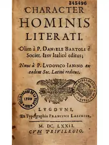 Louis Janin, S.J. (1590-1672) began as a teacher of classical style in France and spent 15 years in Rome as Latin secretary for the French Assistancy at Jesuit headquarters before he returned to Lyons. There he diligently translated five large volumes of Bartoli's Italian Istoria della Compagnia di Gesu between 1665 and 1671. His Latin version of the L'huomo di lettere appeared in Lyons in 1672.[15] A second printing appeared in Cologne in 1674 "opusculum docentibus atque ac discentibus utile ac necessarium".[16] In 1704 this Latin translation was partially reprinted by the Jesuit Faculty of Theology at University of Wroclaw (Breslau), recently founded by Leopold I, Holy Roman Emperor. It was issued in honor of its first graduates, four new doctors of theology.[17] To Janin's version was added a second translation into Latin by the Lutheran pastor in the service of Frederick I of Prussia in Prussian Kűstrin, Johann Georg Hoffmann, (1648-1719) Homo literatus defensus et emendatus. It was printed in nearby Frankfurt an der Oder in 1693.[18] His translation was published by Jeremias Schrey[19] The text contains an excellent system of embedded biblical references.[20] Hoffman became a doctor of Sacred Scripture in 1696.