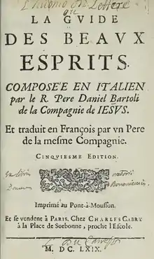 The French translation was first to appear in 1651. It was done by the Jesuit writer Thomas LeBlanc, (1599-1669) upon his return from Italy where the book had made Bartoli famous for his eloquence and erudition. LeBlanc was author of a five-volume commentary on the Psalms of David in Latin and of several pastoral works in French.[5] It first appeared as L'Homme de lettres (Pont-a-Mousson). In 1654 it was reprinted under the more galant title, La Guide des Beaux Esprits and as such went through several editions. The fifth printing of 1669 was dedicated to Charles Le Jay, Baron de Tilly, from the ascendant noblesse de robe, influential supporters of the Society of Jesus and its colleges.[6] Timothée Hureau de Livoy (1715-1777), a Barnabite priest and lexicographer was the translator of Denina and Muratori. In 1769 his Bartoli translation appeared with critical notes L'Homme de lettres, ouvrage traduit de l'italien augmenté de Notes historiques et critiques[7]