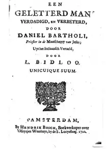 - ↑ Een Geletterd Man Verdadigd, en Verbeterd door Daniel Bartholi