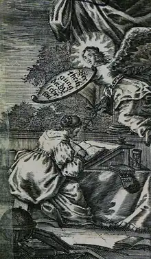 In Nürnberg in 1654 a German version appeared anonymously under the title, Vertheidigung der Kunstliebenden und Gelehrten anstandigere Sitten, The translator, Count Georg Adam von Kuefstein (1605-1656) in his preface signs himself Der Kunstliebende, his moniker as a member of the prestigious language academy, the Fruitbearing Society (Fruchtbringende Gesellschaft) under whose name and auspices the book was issued.[8] There is a frontispiece title engraving with a shielded angel "ratio" defending "Vertheidigung" the writer "eruditio". Underneath the book on the writing table there is a scroll which surreptitiously spells out the author's name as "D. BAR/TOLI". After the title page come the translator's preface and 11 poetical compositions by other Gesellschaft members including the Nurenberger Georg Philipp Harsdörffer, Der Spielende, Sigmund von Birken who oversaw the preparation of the book, Wolf Heimhardt von Hohberg Der Sinnreiche, Cambyse Bianchi del Piano, Der Seltene, from Bologna, who collaborated with Kufstein on the translation, Johan Wilhelm von Stuhlenberg, Der Ungluckselige, Erasmus der Junger von Strahlemberg, Der Liedende, Christoff Dietrick von Schallenberg, Der Schallende and Harsdörffer's son, Carl Gottfried. These poetic exercises, including a pastoral dialogue, introduce the themes of Bartoli's text. Bartoli's numerous Latin quotations are given here in German, directly along with the citations in the margin.[9] At the end there is an index for subjects and one for persons and finally a helpful list of the classical authorities with page numbers.[10]