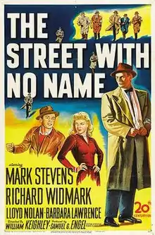 The Street with No Name is a 1948 American film noir directed by William Keighley. A follow-up to The House on 92nd Street (1945), it tells the story of an undercover FBI agent, Gene Cordell (Mark Stevens), who infiltrates a deadly crime gang. Cordell's superior, FBI Inspector George A. Briggs (Lloyd Nolan), also appears in The House on 92nd Street. The film, shot in a semidocumentary style, takes place in the Skid Row section of fictional (actually Los Angeles) "Center City."[2]