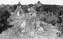 Tikal was the capital of a conquest state that became one of the most powerful kingdoms of the ancient Maya.[5] Though monumental architecture at the site dates back as far as the 4th century BC, Tikal reached its apogee during the Classic Period, c. 200 to 900. During this time, the city dominated much of the Maya region politically, economically, and militarily, while interacting with areas throughout Mesoamerica such as the great metropolis of Teotihuacan in the distant Valley of Mexico. There is evidence that Tikal was conquered by Teotihuacan in the 4th century AD.[6] Following the end of the Late Classic Period, no new major monuments were built at Tikal and there is evidence that elite palaces were burned. These events were coupled with a gradual population decline, culminating with the site's abandonment by the end of the 10th century.