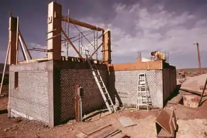 Tin can building in New Mexico originated in the early 1980s as a response to the massive amounts of trash being discarded and the wasteful nature of common building practices. Tin can construction was an attempt to utilize a readily available resource that was normally sent to landfills or recycling centers. This led to various experiments in tin can building, including space-filler between wooden frames in traditional house styles and creating domes and archways using cans and cement. Within time, more simplified and practical methods were developed, such as the earthship tin can wall. The main person behind these efforts was Mike Reynolds, also creator of the earthship building method.