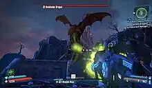 Assault on Dragon Keep is an expansion pack from the first-person shooter role-playing game, Borderlands 2.[4] It maintains the main game's science-fiction, looter shooter, and comedic elements,[5][6] while incorporating elements of tabletop role-playing,[7] including themes from Dungeons & Dragons, and, as a result, creates a concept that integrates fantasy gameplay within a first-person shooter experience.[6] The expansion pack's difficulty is best suited for players who are at least level thirty.[8]