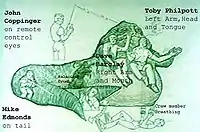 The rest of the puppet team included Barclay on the right arm and mouth; Mike Edmonds on the tail; and John Coppinger, who controlled the eyes via remote control and gave the others feedback based on what he saw from the outside.[5] Philpott would later describe sitting inside the Jabba puppet with Barclay as being "like a two-man submarine" because it was very hot, cramped and uncomfortable.[4] A monitor inside the puppet shows a general shot of Jabba that helped the puppeteers operate, although they could not tell where the frame of the shot was from the image; the team depended on feedback amongst themselves, and their training under Jim Henson gave them experience in coordinating to create a single creature.[5]