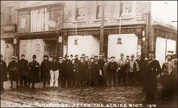 What became known as the Tonypandy riots[1] of 1910 and 1911 (sometimes collectively known as the Rhondda riots) were a series of violent confrontations between the striking coal miners and police that took place at various locations in and around the Rhondda mines of the Cambrian Combine, a cartel of mining companies formed to regulate prices and wages in South Wales.