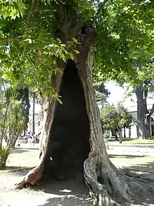 The Imperial Gate is the main entrance into the First Courtyard.[21] The sultan would enter the palace through the Imperial Gate (Turkish: Bâb-ı Hümâyûn, meaning "Royal Gate" in Persian, or Saltanat Kapısı) located to the south of the palace.[22] This massive gate, originally dating from 1478, is now covered in 19th-century marble. Its central arch leads to a high-domed passage; gilded Ottoman calligraphy adorns the structure at the top, with verses from the Qur'an and tughras of the sultans. The tughras of Mehmed II and Abdulaziz, who renovated the gate, have been identified.[23]
