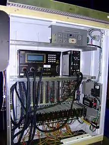 A traffic signal is typically controlled by a controller mounted inside a cabinet.[10] Some electro-mechanical controllers are still in use (New York City still had 4,800 as of 1998, though the number is lower now due to the prevalence of the signal controller boxes[11]). However, modern traffic controllers are solid state. The cabinet typically contains a power panel, to distribute electrical power in the cabinet; a detector interface panel, to connect to loop detectors and other detectors; detector amplifiers; the controller itself; a conflict monitor unit; flash transfer relays; a police panel, to allow the police to disable the signal; and other components.[10]