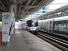 The Bangkok BRT is a bus rapid transit system in Bangkok. Of five routes that were originally planned, only one line has been operating since 2010. The 16 kilometres (9.9 mi) route has twelve stations in the centre of the road that give at-grade access to the right-hand side of the buses. Both terminals connect to the Silom Line of the BTS Skytrain; at Chong Nonsi (S3) and Talat Phlu (S10). The buses used are all Sunlong SLK6125CNG buses. The fare is currently on hold(free for 3 months till 30 November 2023) for reconsideration of the effectiveness of the project.[28]