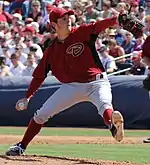 On June 27, 2012, the Diamondbacks called Bauer up from Reno in order to replace an injured Joe Saunders. He was scheduled to start the next day, becoming the first member of the 2011 draft class to make his MLB debut.[25] Although the Diamondbacks defeated the Atlanta Braves 3–2, Bauer earned a no-decision in his major league debut, pitching four innings before suffering a groin strain that required him to leave the mound.[26] He picked up his first win on July 8, holding the Los Angeles Dodgers to six scoreless innings as the Diamondbacks ultimately won 7–1.[27] After four major league starts, during which Bauer went 1–2 with a 6.06 ERA, he was sent back down to Reno, where he was shut down for a period of two weeks in order to preserve his health during his first full season of professional baseball.[28] He finished the season there, helping the Aces reach their first Pacific Coast League and Triple-A baseball championships. In the championship game against the Pawtucket Red Sox of the International League, Bauer took another no decision as he allowed two runs in 4+2⁄3 innings.[29] In 14 total starts for Reno, Bauer posted a 5–1 record and a 2.85 ERA, striking out 97 batters in 82 innings.[21]