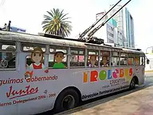 One of the trolleybuses when it was still painted for the "Trolebuses Educativos" programme, in 2011. This is the bus's right side, and the trolley poles have been swung around to point towards the front end.