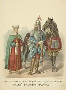 A warrior of the Russian noble cavalry (поместная конница) during the Russo-Polish War of 1654–1667. The drawing is based on the pieces preserved in the Kremlin Armoury.