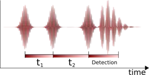 The time-domain approach consists of applying two pump pulses. The first pulse creates a coherence between the vibrational modes of the molecule and the second pulse creates a population, effectively storing information in the molecules. After a determined waiting time, ranging from a zero to a few hundred picoseconds, an interaction with a third pulse again creates a coherence, which, due to an oscillating dipole, radiates an infrared signal. The radiated signal is heterodyned with a reference pulse in order to retrieve frequency and phase information; the signal is usually collected in the frequency domain using a spectrometer yielding detection frequency . A two-dimensional Fourier-transform along then yields a (, ) correlation spectrum. In all these measurements phase stability among the pulses has to be preserved. Recently, pulse shaping approaches were developed to simplify overcoming this challenge.[5][6]