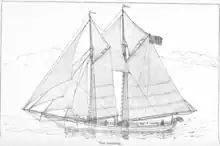 To address these issues, Grampus, although similar in design to the traditional New England schooner, also differed in significant ways.[4] She had a hull 18 to 24 inches (0.5 to 0.6 m)[2] deeper than traditional schooners of similar length, giving her greater stability, and her beam was 6 to 10 inches (0.2 to 0.3 m) less than that of a traditional schooner.[2] She had a straight stem, rather than a raking one, and her stern was narrower and more raked, with her after portion approximating a V-shape, all changes which increased her hull length at the waterline. Her foremast was considerably shorter than her mainmast, and her rigging was designed so that she could carry a double-headed rig forward that allowed her to use a smaller jib that could be furled upon the approach of heavy weather and a fore staysail running from the foremast to near her stem. The result was a ship able to achieve higher sailing speeds, able to make more efficient use of her sails, with no need for crew members to work on her bowsprit during bad weather, and less likely to capsize in heavy seas.[4]
