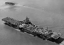 The keel for Intrepid was laid down on 1 December 1941 in Shipway 10 at the Newport News Shipbuilding & Dry Dock Co., Newport News, Virginia, days before the Japanese attack on Pearl Harbor and the United States' entrance into World War II. She was launched on 26 April 1943, the fifth Essex-class aircraft carrier to be launched. She was sponsored by the wife of Vice Admiral John H. Hoover. On 16 August 1943, she was commissioned with Captain Thomas L. Sprague in command before heading to the Caribbean for shakedown and training. She thereafter returned to Norfolk, before departing once more on 3 December, bound for San Francisco. She proceeded on to Pearl Harbor, Hawaii, arriving there on 10 January, where she began preparations to join the rest of the Pacific Fleet for offensive operations against the Imperial Japanese Navy.[1][2]