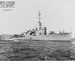 Long continued escort and patrol operations for the occupations of Attu and Kiska through the summer, returning to Pearl Harbor on 16 September to escort merchantmen to San Francisco where she overhauled. After patrol in Hawaiian waters from 15 November to 22 January 1944, she escorted reinforcements to Roi and Namur in the Marshalls on 2 February, then joined TF 76 on 28 February in New Guinea waters. She served as an escort and swept mines in the conquest of the Admiralties early in March, then escorted convoys to and from Milne Bay, Guadalcanal, and Espiritu Santo from Cape Sudest.