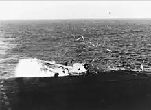 An Avenger (Bureau Number 24295), of VC-9,[11] piloted by Ens. G.E. Edwards, hits the ramp of Solomons, 25 March 1944.[12] The two aviators within were rescued, but they will perish in the attack on U-860 on 15 June 1944.[13]
