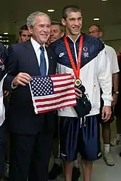 Swimmer Michael Phelps and President George W. Bush on August 10, 2008, at the National Aquatic Center in Beijing. Phelps is the most decorated Olympic athlete of all time.[6][7]