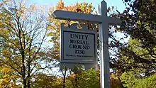 The Unity Burial Ground is a small graveyard located on the southeast end of White Plain in the Nichols section of Trumbull, Connecticut. It is located a few rods north of the site of the first meeting house that was built in the parish of Unity, off of White Plains Road. The cemetery was laid out in 1730 and the first burial was that of 7 year old Samuel Bennitt on June 21, 1731.[1][2] There are over 110 gravestones, 90 unmarked field stones and 241 known grave sites, and most of the original stones face east. This is unusual, as it runs contrary to the common practice of placing stones so that they face the road.[3] The latest known burial was for Charles E Booth Jr. on August 17, 1935.[4]