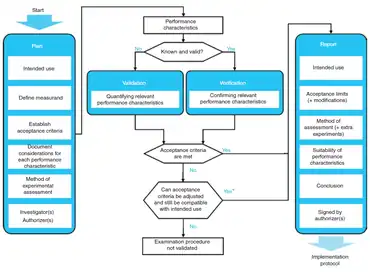 - 1 2 3 Roelofsen-de Beer R, Wielders J, Boursier G, Vodnik T, Vanstapel F, Huisman W; et al. (2020). "Validation and verification of examination procedures in medical laboratories: opinion of the EFLM Working Group Accreditation and ISO/CEN standards (WG-A/ISO) on dealing with ISO 15189:2012 demands for method verification and validation". Clin Chem Lab Med. 58 (3): 361–367. doi:10.1515/cclm-2019-1053. hdl:2066/217437. PMID 31714885.