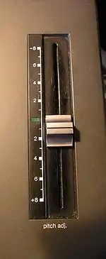 A variable speed pitch control (or vari-speed) is a control on an audio device such as a turntable, tape recorder, or CD player that allows the operator to deviate from a standard speed (such as 33, 45 or even 78 rpm on a turntable), resulting in adjustments in pitch.[1] The latter term "vari-speed" is more commonly used for tape decks, particularly in the UK. Analog pitch controls vary the voltage being used by the playback device; digital controls use digital signal processing to change the playback speed or pitch. A typical DJ deck allows the pitch to be increased or reduced by up to 8%, which is achieved by increasing or reducing the speed at which the platter rotates.