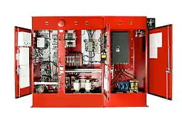 A Variable Speed (VFD) Fire Pump Controller is a fire pump controller that is able to vary the speed of the motor depending on the demand of the fire pump, resulting in the ability to hold a constant discharge pressure. It differs from other industrial variable speed control devices because it is now considered a life safety device, and so must adhere to the more rigid standards set forth by NFPA-20.