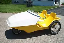 A velomobile (/ˈvɛloʊmoʊˌbil/); velomobiel, velo, or bicycle car is a human-powered vehicle (HPV) enclosed for aerodynamic advantage and/or protection from weather and collisions.[1] Velomobiles are similar to recumbent bicycles, pedal go-karts and tricycles, but with a full fairing (aerodynamic or weather protective shell) and are not to be confused with purpose-built mobiles for racing or speed records fully faired vehicles with two wheels, generally called streamliners. Streamliners have set many speed and distance records.[2]