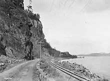 During construction of a level crossing at Smørstein on 17 August 1918 the area around the track started experiencing a series of landslides.[27] Within a few days the earthwork under the tracks had slid away. Vy hired a steamship to freight passengers and cargo past the effected area, and part of the traffic was freighted across the fjord from Horten to Moss.[28] A temporary line was built close to the mountain, while construction took place of a temporary solution, the Smørstein Tunnel.[29] The temporary line opened on 28 October 1918 and the new segment with a tunnel on 25 May 1921.[30]