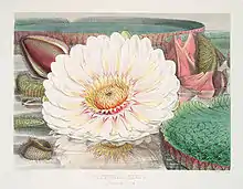 The species captured the imagination of the public and was the subject of several dedicated monographs. The botanical illustrations of cultivated specimens in Fitch and W.J. Hooker's 1851 work Victoria Regia[23] received critical acclaim in the Athenaeum, "they are accurate, and they are beautiful".[24] "The Duke of Devonshire presented Queen Victoria with one of the first of these flowers and named it in her honour. The lily, with ribbed undersurface and leaves veining "like transverse girders and supports", "as Paxton's inspiration for The Crystal Palace, a building four times the size of St. Peter's in Rome."[25]