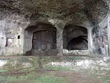 Its position on the site of a former entrance to the imperial villa, would suggest that it was a monumental entrance and nymphaeum to the residence.[31] Inside there were playing fountains, as shown by the water pipes and pools in the niches.